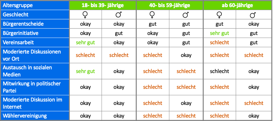 Analysiert man die Beteiligungsbereitschaft etwas genauer, so fällt auf, dass Männer generell etwas beteiligungsbereiter sind als Frauen. Der höchste Anteil der an Beteiligung Interessierten findet sich in der Gruppe der jüngeren Männer im Alter zwischen 18 und 39 Jahren, während die Frauen der gleichen Altersgruppe den geringsten Anteil beteiligungsinteressierter Personen aufweist. Das Verhältnis zwischen beteiligungsbereiten Frauen und Männern beträgt in dieser Gruppe etwa 1:2,5. Mit zunehmendem Lebensalter nähern sich die Anteile etwas an, das heißt, der Anteil der Beteiligungsbereiten geht bei den Männern etwas zurück, während der Anteil beteiligungsbereiter Frauen etwas zunimmt. Bei den über 60-Jährigen beträgt das Verhältnis zwischen Frauen und Männern im Hinblick auf die Beteiligungsbereitschaft etwa 2:3.